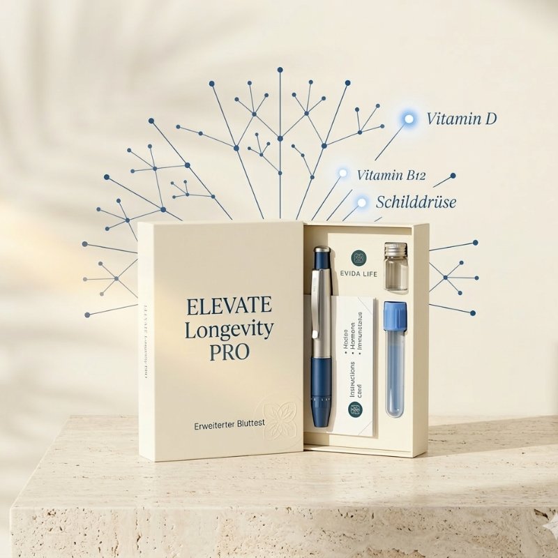 Alles aus Core plus 17 weitere Marker: Hormone (Testosteron, DHEA-S, Cortisol, IGF-1, SHBG), Herz-Kreislauf (Homocystein, Omega-3-Index), Eisenpanel (Eisen, Ferritin, Transferrin), Mineralstoffe (Zink, Magnesium, Kalzium, Selen, Folat, Jod) und Harnsäure. Plus Griffstärke und AGEs-Hautscanner. Das umfassende Longevity-Panel.